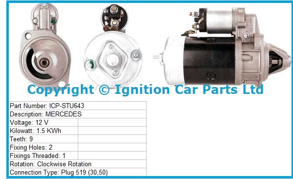 Volts 12, KW 1.5, teeth amount 9,fixing bolts 2 Clockwise Rotation, Please note all our Starter motors are Exchange units and will carry a surcharge
