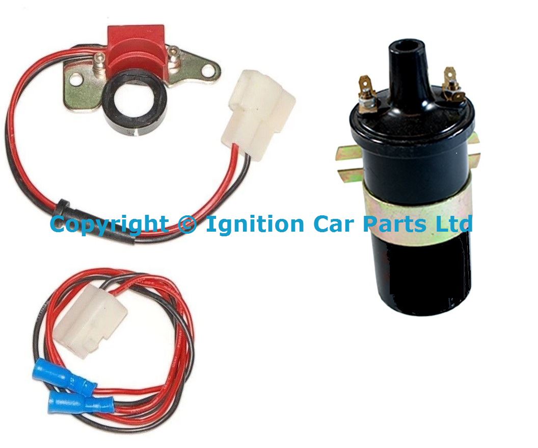 Electronic conversion kit with ignition coil, The kit fits inside 4CLY Ford distributor, replaces worn out points, reliable, damp proof and easier starting. For Motorcraft / Autolite Distributors this easy to fit system can transform any classic into a reliable everyday mode of transport. Not affected by damp conditions, better fuel Economy, better starting. Easy to fit often only taking 5 minutes, no holes to drill, no complicated wiring, no need to get spark gap or dwell correct as this is automatic and best of all nothing bolted to the outside of the distributor. These smaller than a match box units fit inside the distributor in the same place as the points, just 2 wires come out from the distributor to the ignition coil.