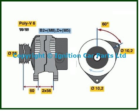 Vehicle Main Current: for vehicles with 12V main current, Voltage: 14 V, Alternator Charge Current: 120 A, Pulleys: with multi-belt pulley, Number of Ribs: 6, Belt Pulley Ø: 56 mm, Clamp: M8 B+, Plug-type ID: M5 D+ Plug 230, Length 1: 51 mm, Length 2: 51 mm, Bore Ø 1: 11 mm, Length 3: 59 mm Please note all our Starter motors are Exchange units and will carry a surcharge