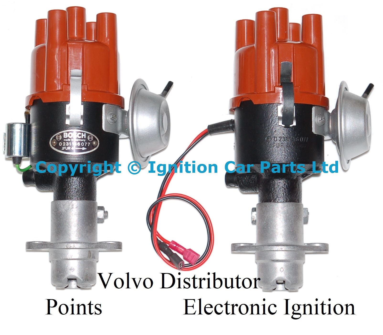New Points Distributor , also see our Up Grade to electronic ignition kit no more cold morning starting problems and better fuel economy New ultra-spark Electronic Distributor complete with new cap and rotor arm ignition coil to replace points distributors Easy to fit just two wires to connects to the coil, just connect the Red wire to the + side and the Black to the - side of the coil